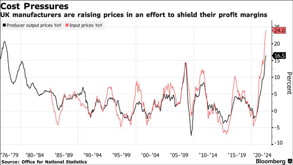 生产者出厂价和投入价同比涨跌幅,彭博社援引英国国家统计局数据