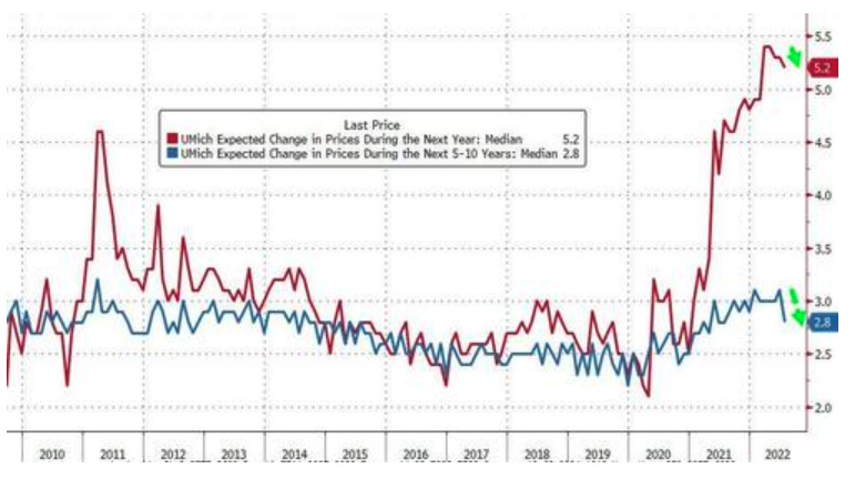 过去约一年的时间里,密歇根5年通胀预期处在2.9%-3.1%的窄幅波动区间,而6月初值一度打破该区间,达到3.3%,创下2008年以来的最高,令市场颇为关注,认为是长期通胀预期松动的表现,最新5年期通胀预期大幅下跌至2.8%,令通胀预期可能失控的担忧大幅缓解。