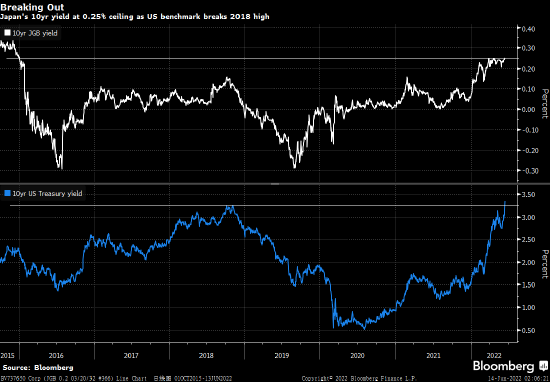 美联储和欧洲央行相继被迫采取行动抗通胀。从全球债市来看,最后也是最重要的参与者日本央行何时转向上调收益率曲线控制上限以支撑日元将是关注焦点。在这个债券投资者已倍受冲击的年头,日本央行一旦转向,料将引发美债地震。